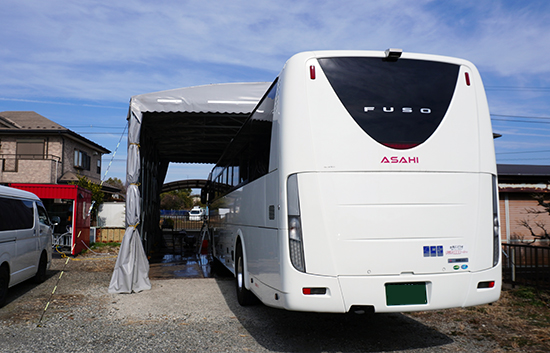 大型バス特有の高さがありますので、複数名のスタッフで安全を確認しながら作業を進めます。