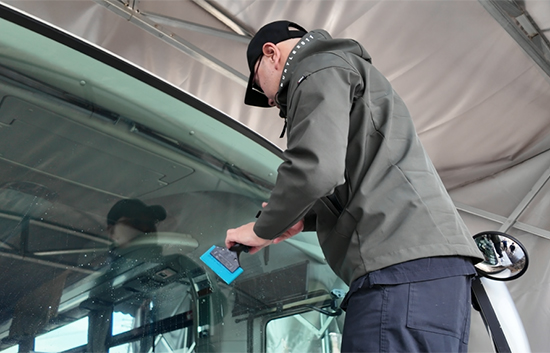 このたび、神奈川県A様より、大型バスのフロントガラス飛び石対策施工のご依頼をいただきました。