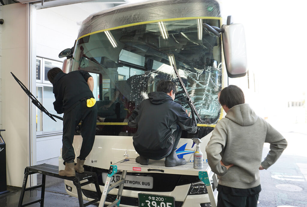 施工は1チーム3名体制を基本として行います。作業はバスのフロントガラス面に付着した汚れを徹底的に除去する工程から開始します。施工スピードと品質の両立を重視しており、1チームあたり1日に2台の施工を基本としています。
